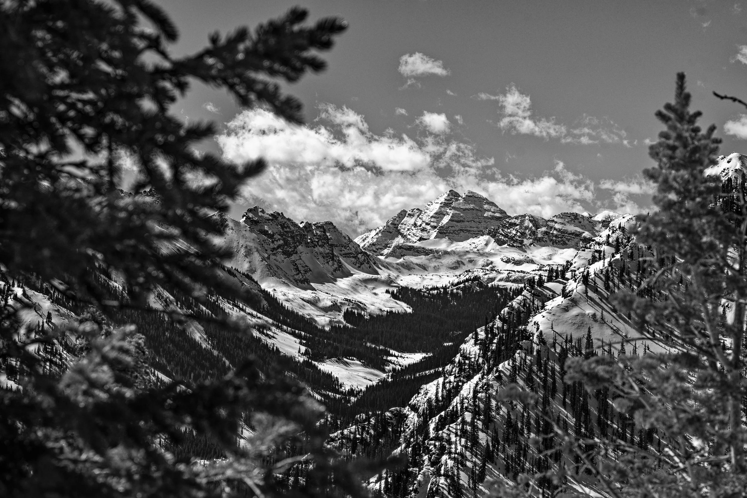 A timeless view of the iconic Maroon Bells reflected in the calm waters of Maroon Lake. Presented in striking black and white, this fine art photograph highlights the dramatic peaks, alpine forests, and quiet beauty of the Colorado mountains—bringing a sense of serenity and elegance to any space.