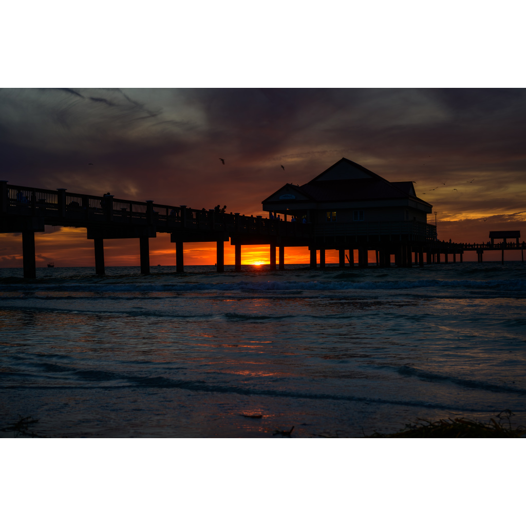 Strolling along Honeymoon Island near to Clearwater Beach, Florida. As the sun dips below the horizon, the sky ignites in shades of gold and deep indigo. Gentle waves trace the shoreline, reflecting the fading light, while a solitary post stands sentinel against the endless sea. It’s a moment of quiet, where nature holds its breath and beauty lingers in the balance.